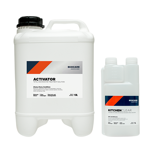 EcoCare Activator and Kitchen Clear will fillyour system with the right bacteria to digest fat, oil and grease, eliminate odours and improve performance.